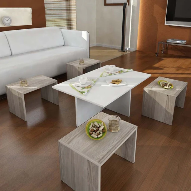 عند عدم الاستخدام، تعود الطاولات الأربعة الصغيرة لتستقر تماماً أسفل الطاولة الرئيسية، مما يوفر مساحة واسعة في غرفة المعيشة ويمنحها مظهراً مرتباً وأنيقاً. يمكنك أيضاً استخدام الأسطح المتباينة لتقسيم الديكور وعرض الإكسسوارات.