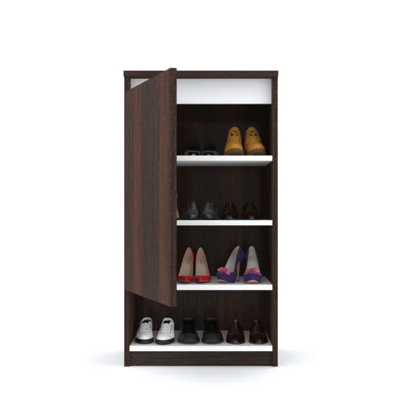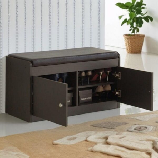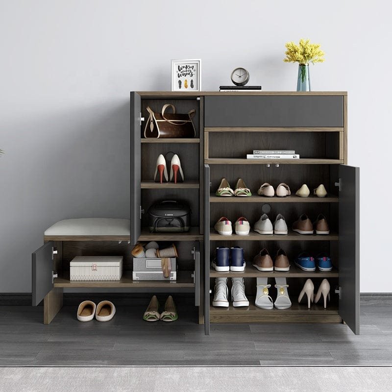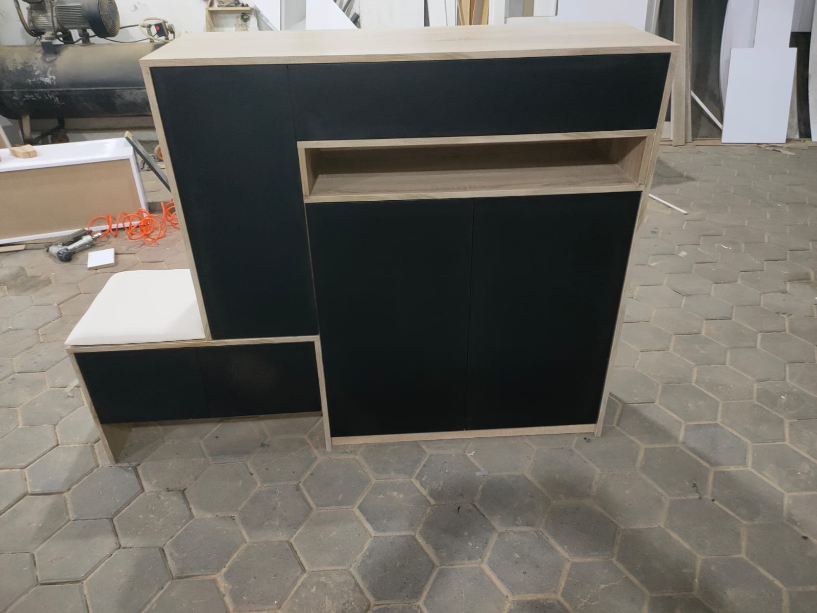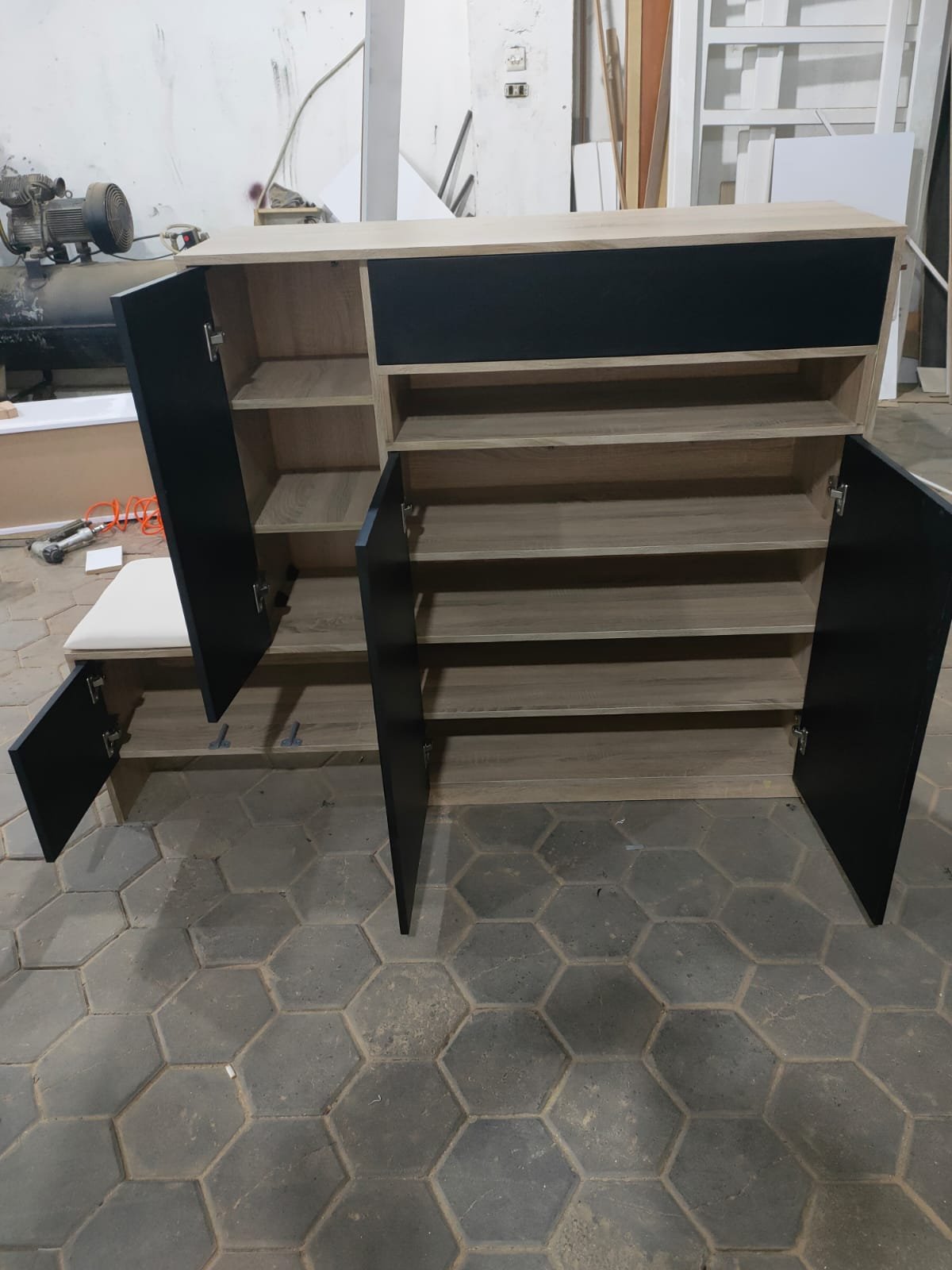 خزانة أحذية عصرية بتصميم أنيق ومتعدد الاستخدامات، تجمع بين التخزين العملي ومقعد مريح. مزودة برفوف واسعة لتنظيم الأحذية , ودلفة خزائن إضافية للإكسسوارات، مثالية لترتيب مدخل المنزل بأناقة.