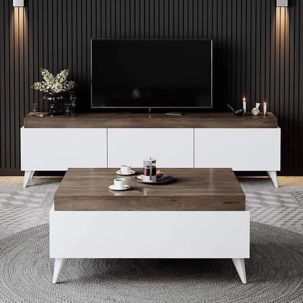 ما يميز هذا الطقم المتكامل هو التناغم البصري بين ترابيزة التليفزيون و ترابيزة القهوة. كلتا القطعتين مصنوعتان من خشب MDF عالي الجودة، مما يوفر متانة وثباتًا موثوقًا.